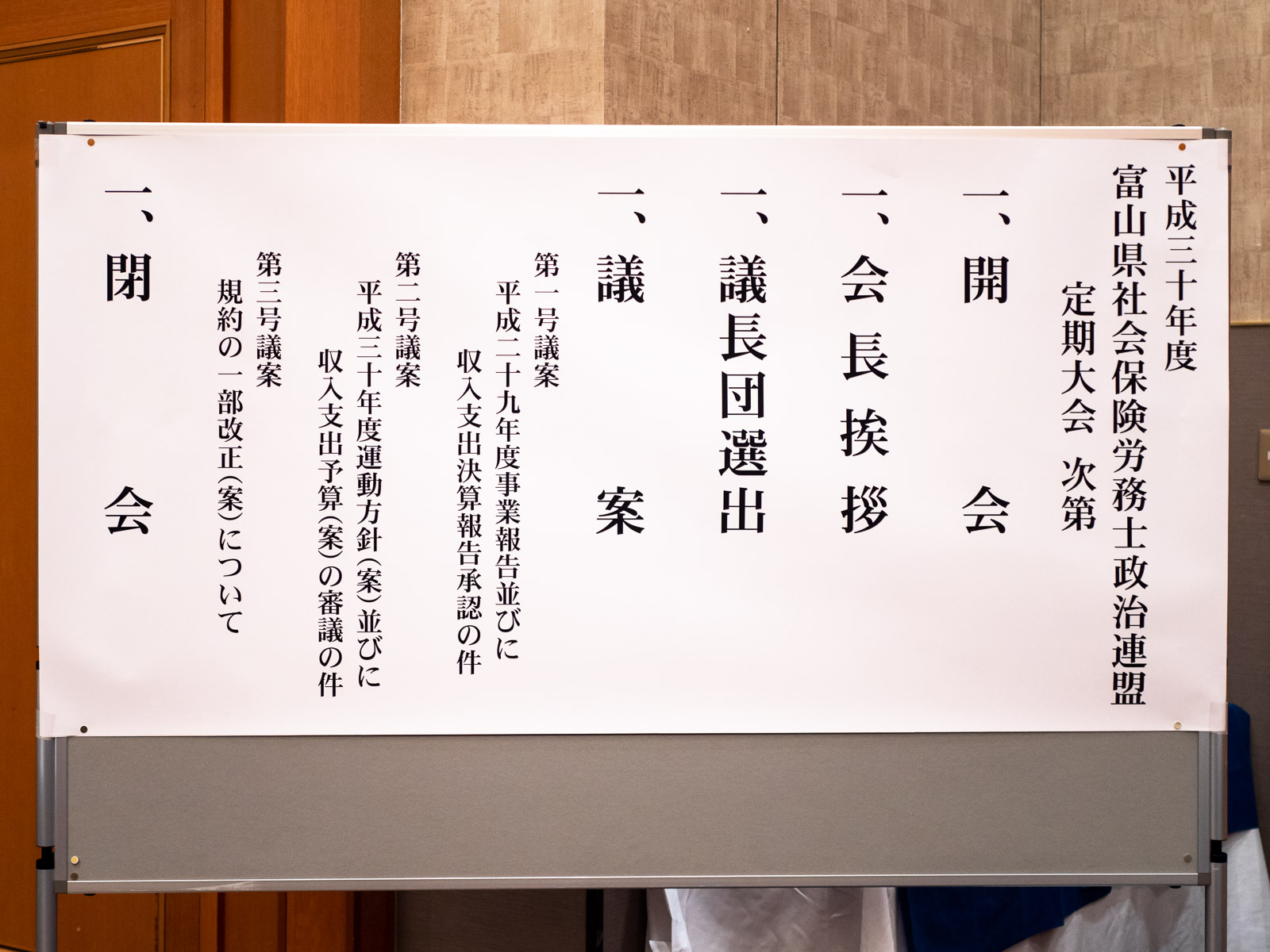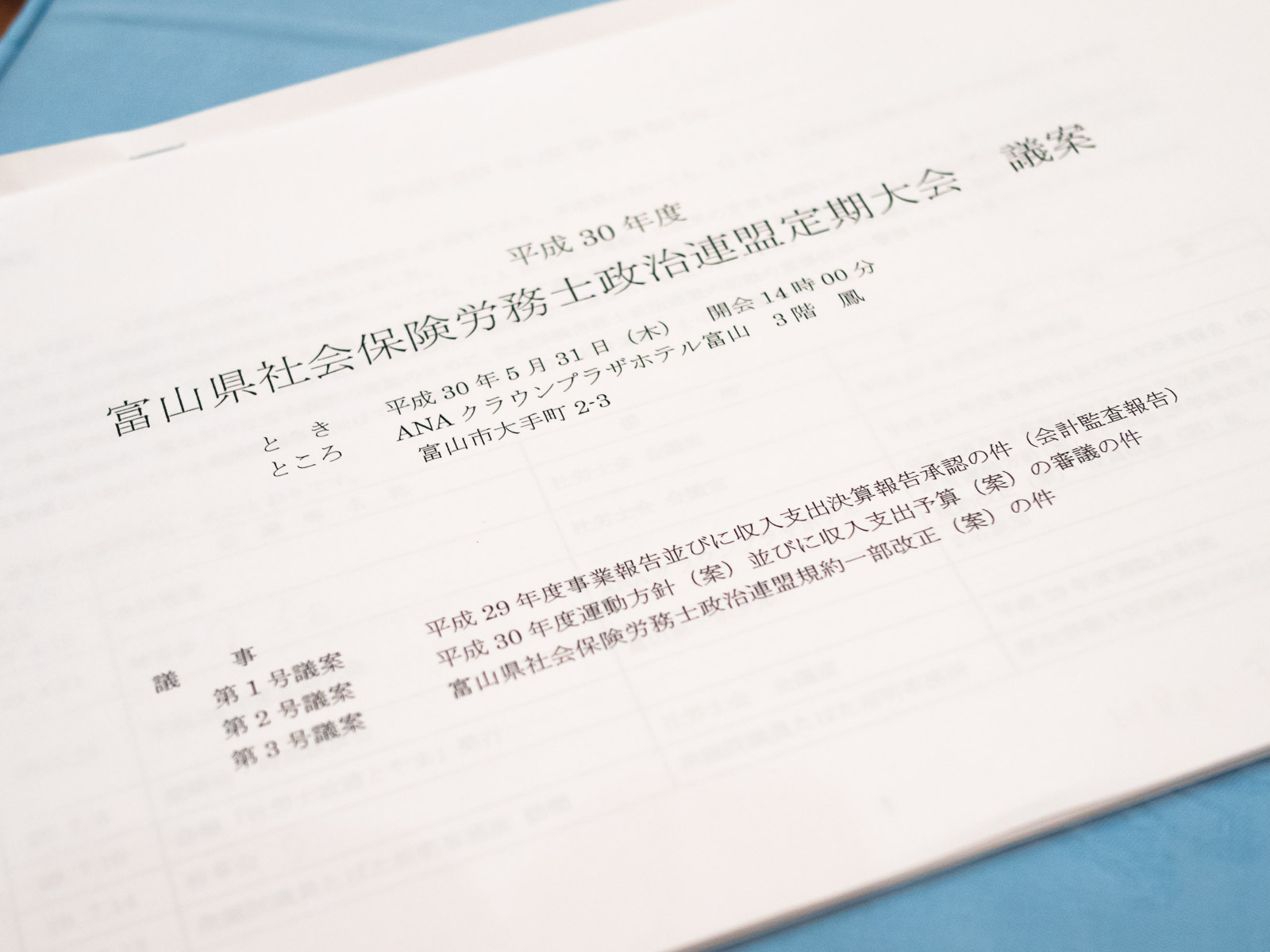 2018年5月31日 / 最終更新日時 : 2018年6月5日 shinyakamiichi 定期大会・会議等 定期大会 2018.05.31(木) 日時・場所 日時:平成30年05月31日(木) 14時〜 場所:ANAクラウンプラザホテル富山 内容 定期大会 議案 第1号議案 平成29年度事業報告並びに収入支出決算報告承認の件(会計監査報告) 第2号議案 平成30年度運動方針(案)並びに収入支出予算(案)の審議の件 第3号議案 富山県社会保険労務士政治連盟規約一部改正(案)の件 終了後、県会との合同懇親会